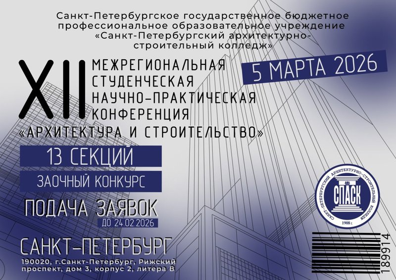 5 марта в 10:00 на базе Санкт-Петербургского архитектурно-строительного колледжа состоится XII межрегиональная студенческая научно-практическая конференция «АРХИТЕКТУРА и СТРОИТЕЛЬСТВО». Мероприятие проходит с целью привлечения студентов к научно-практической деятельности и исследовательской работе. Главные задачи – выявление талантливых студентов и установление новых контактов для сотрудничества в области развития науки.